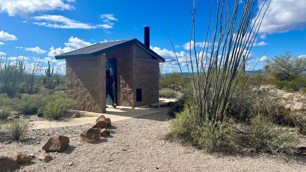 This particular one was relatively clean, had toilet paper, and hand sanitizer, didn’t smell, had an awning, and could sleep one person comfortably or two in a pinch.