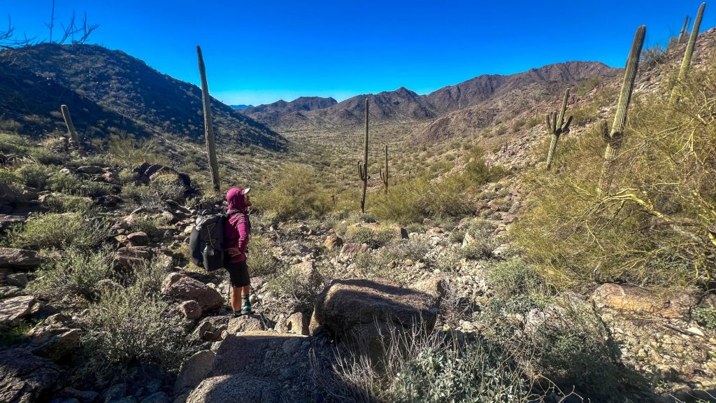 We dipped in and out of washes but didn’t use them as much because they got choked up with palo verde trees, mesquite, and even a few catclaw plants. I’ll avoid catclaw any time it’s possible to do so.