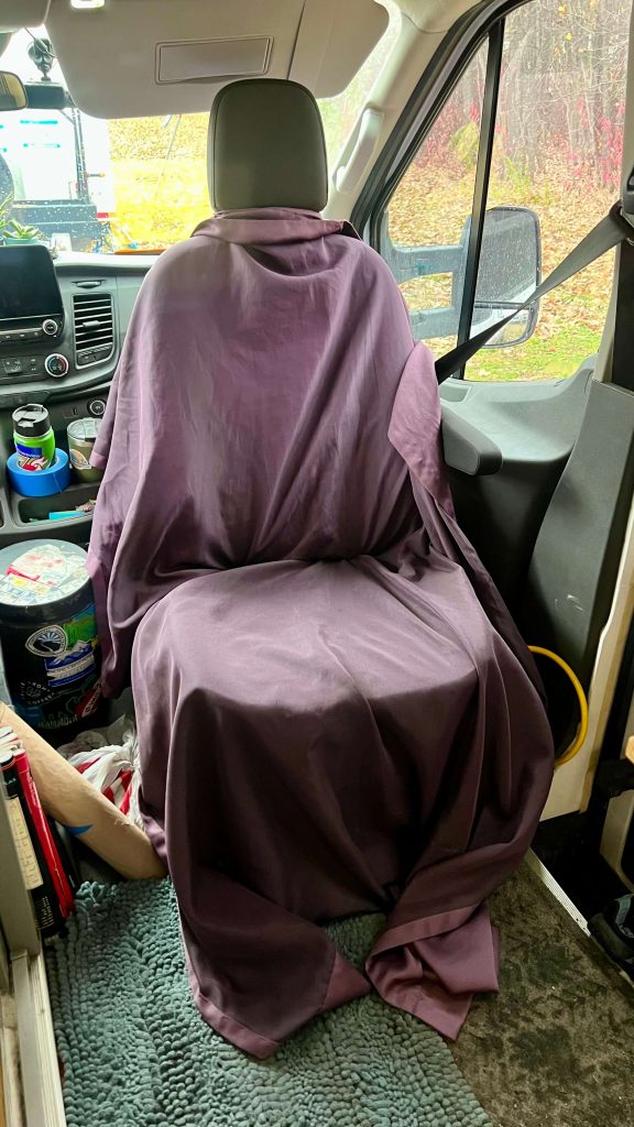 We found several $3 fabric curtains at a thrift store and secured them on our seats and cushions with binder clips.